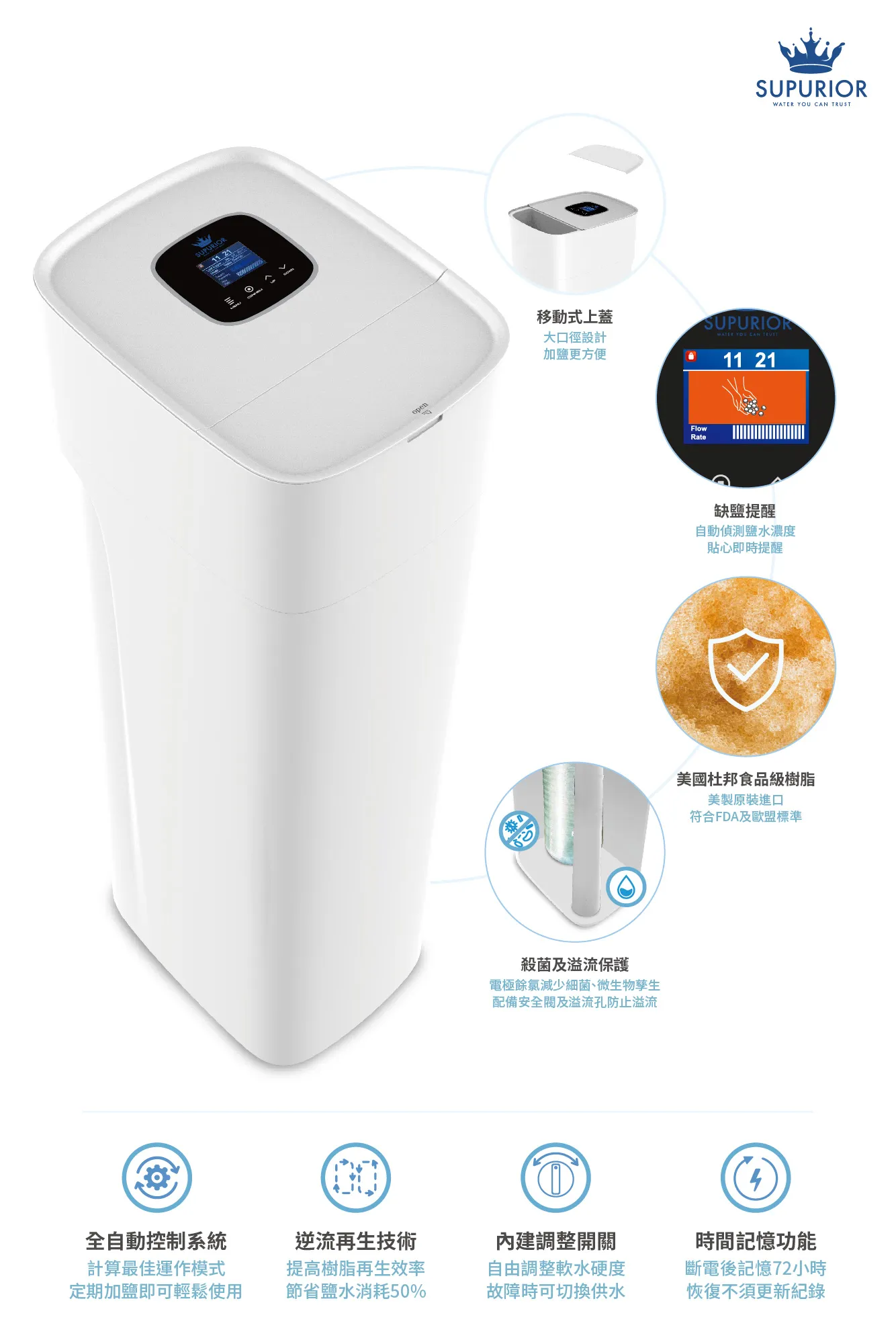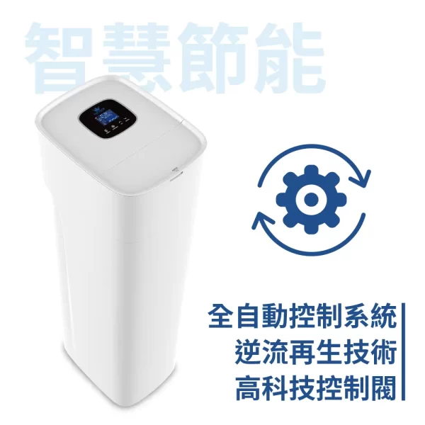 全自動控制系統,自動計算再生過程、用水週期等資訊,只需要定期加鹽,即可享受舒適生活
